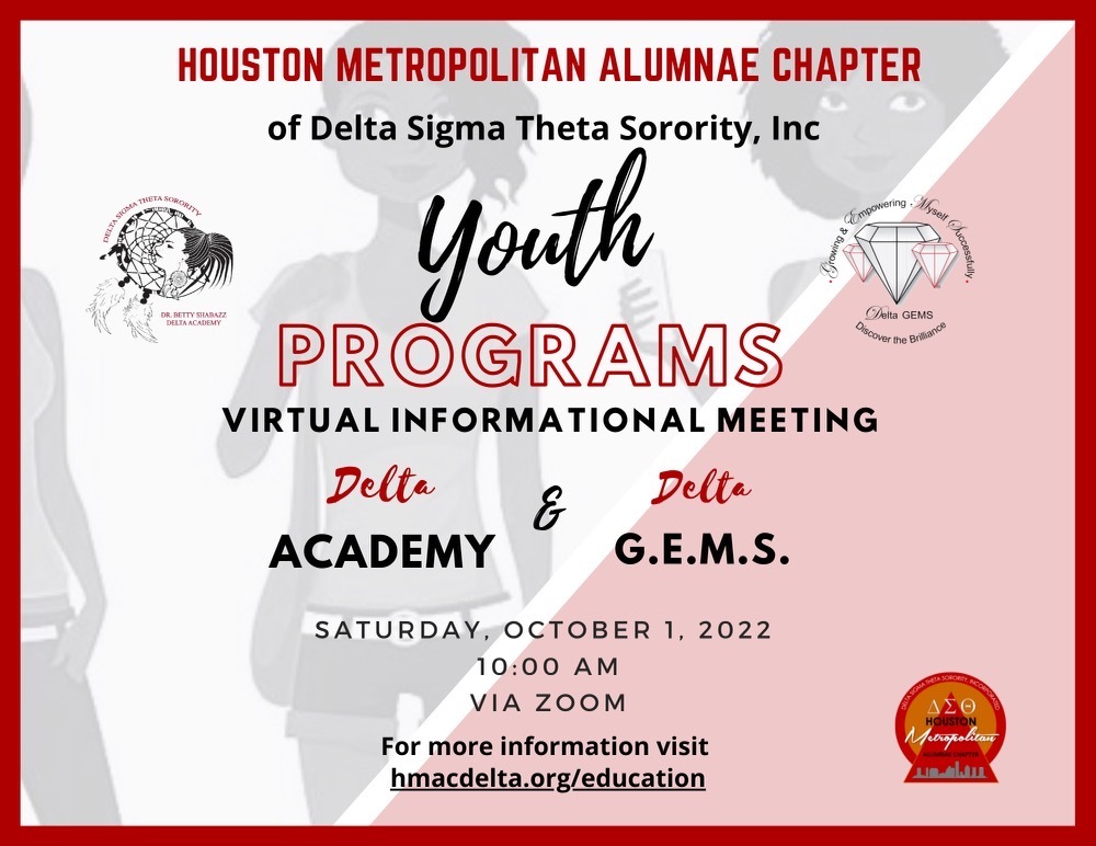 IMPORTANT NOTE: APPLICATION FOR BOTH PROGRAMS SHOULD BE FILLED OUT AND RETURNED BY SATURDAY, SEPTEMBER 24, 2022. Applications for each program can be found at hmacdelta.org/Education respectively under the Delta Academy or Delta GEMS sections.